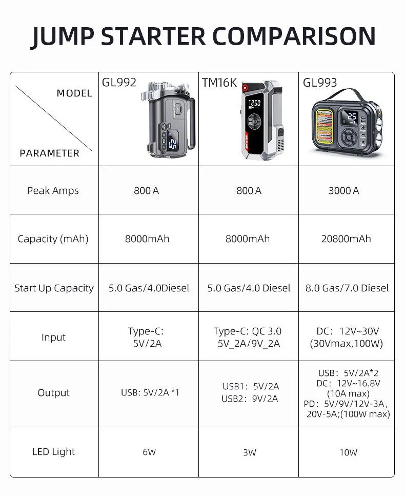 Powerful and Safe: Featuring a robust 1000A cranking current, this car battery jump starter can instantly restart your 12V vehicles, making it ideal for gas engines up to 6.0L and diesel engines up to 5.0L.