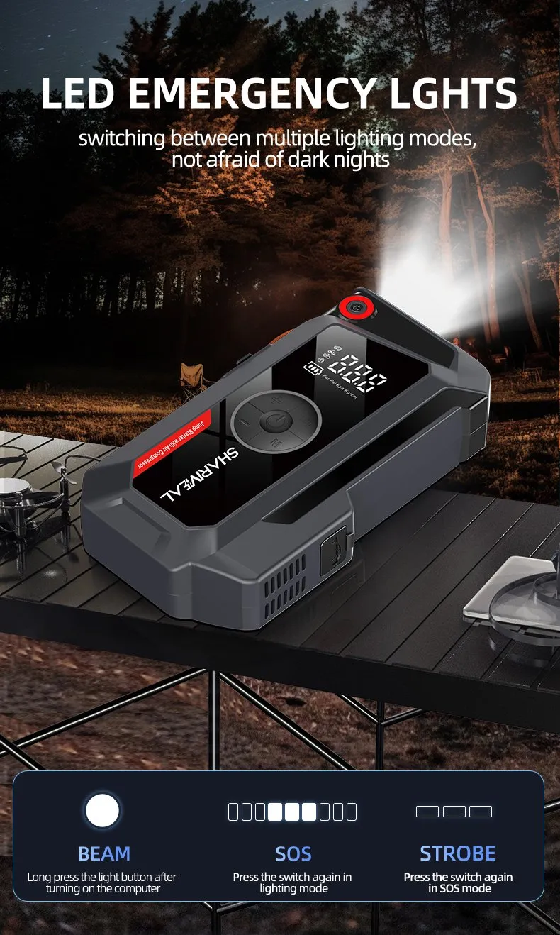 The high-brightness LED flashlight delivers an impressive 400 lumens of light, allowing you to start your vehicle at night with ease. With 3 modes—constant light, strobe, and SOS—this flashlight is perfect for camping, outdoor activities, emergencies, and travel. Additionally, the jump starter functions as a portable power bank, featuring a USB port to recharge your devices. It supports up to 48 hours of high-brightness lighting, ensuring that you’re well-prepared for any situation.