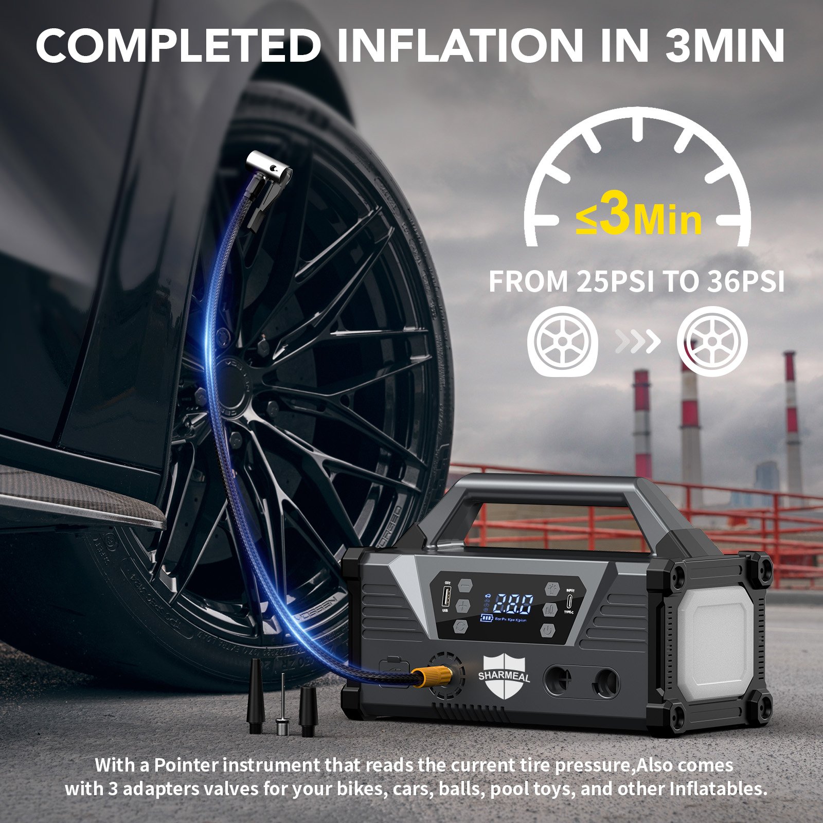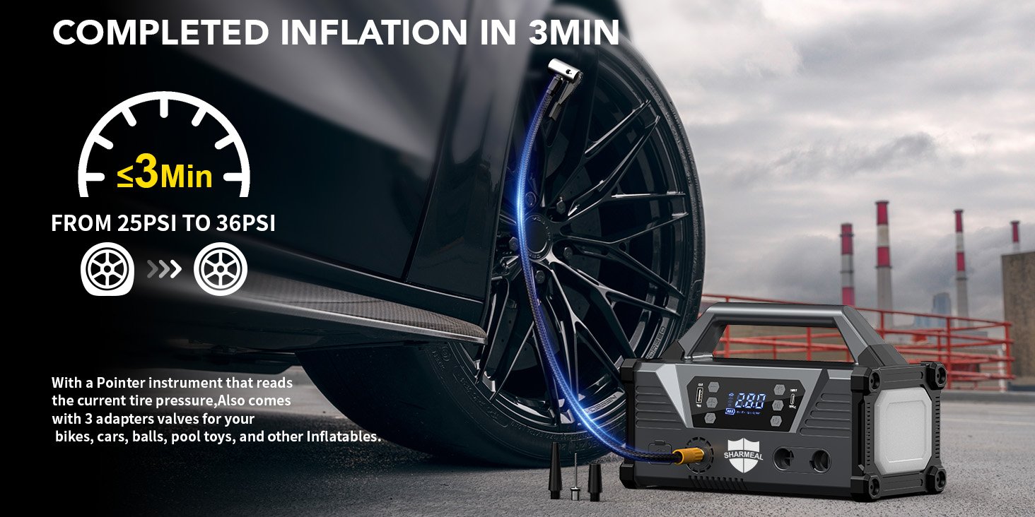 pressure (up to 150 PSI) inflates car tires, bike tires, sports balls, inflatable boats, and camping mattresses quickly and accurately, with an auto-shutoff function to prevent over-inflation.