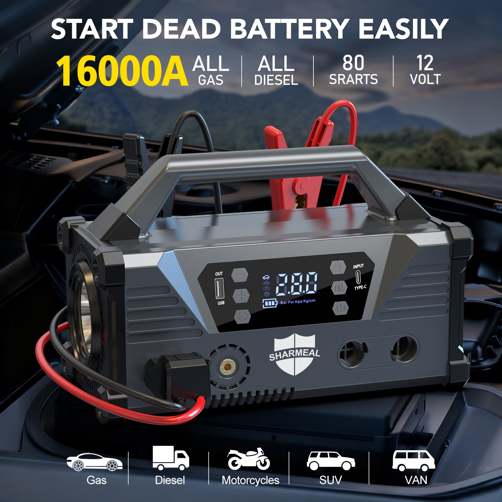 lighting for night activities, this 16000mAh multifunctional Jump Starter with air pump, blower, and 8W LED light is your all-in-one solution for safety, convenience, and versatility.