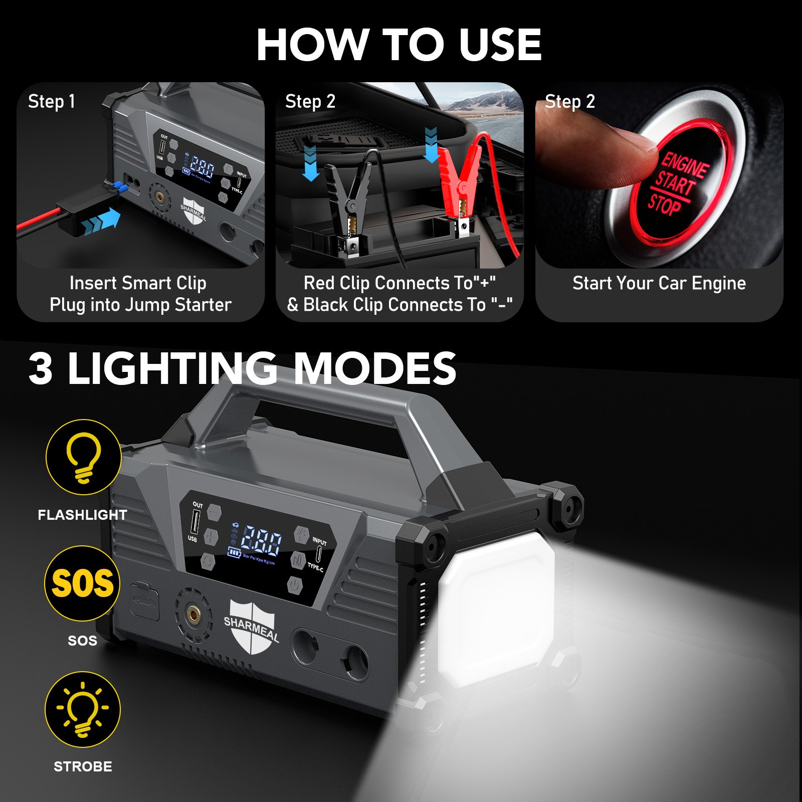 Description | Jump starter for car, light van, motorcycle, yacht, snowmobile, cell phone, etc |