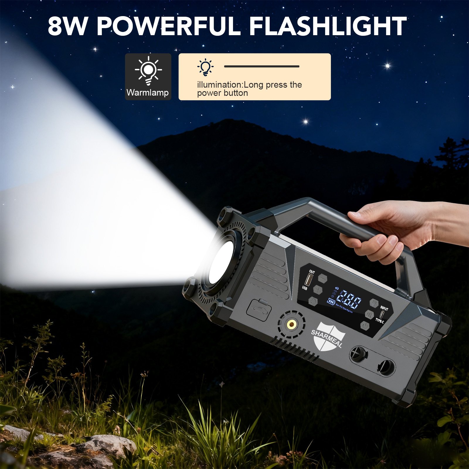 The integrated 8W super-bright LED camping light is a must-have for outdoor camping and low-light scenarios. It provides powerful high-brightness illumination to light up your entire campsite,